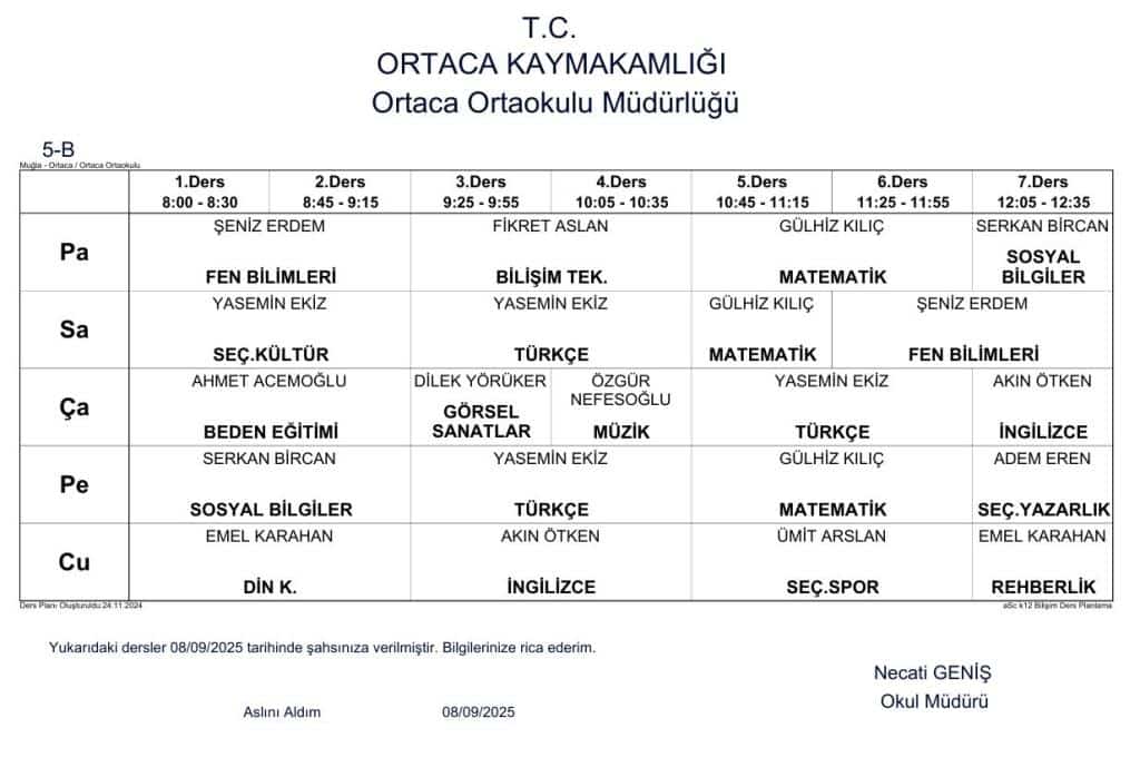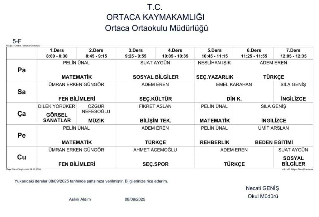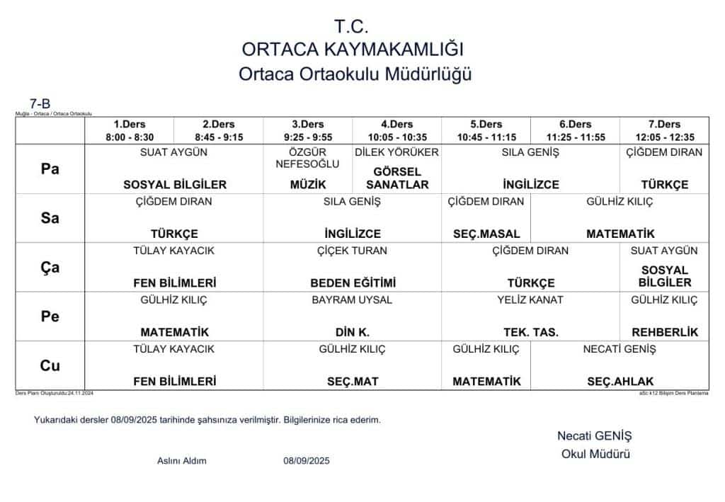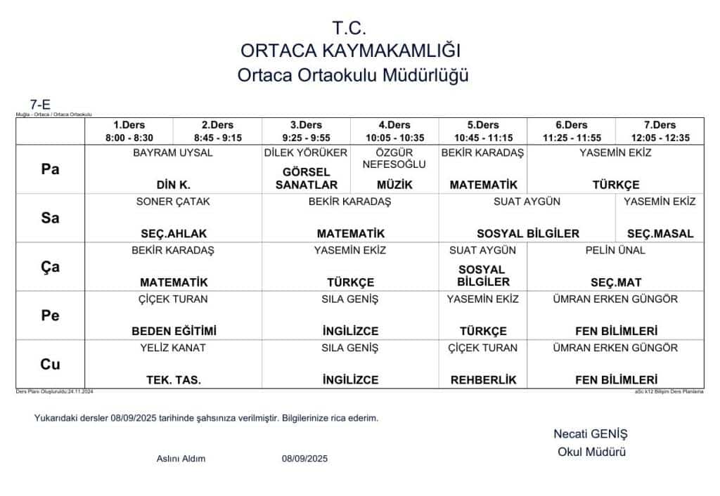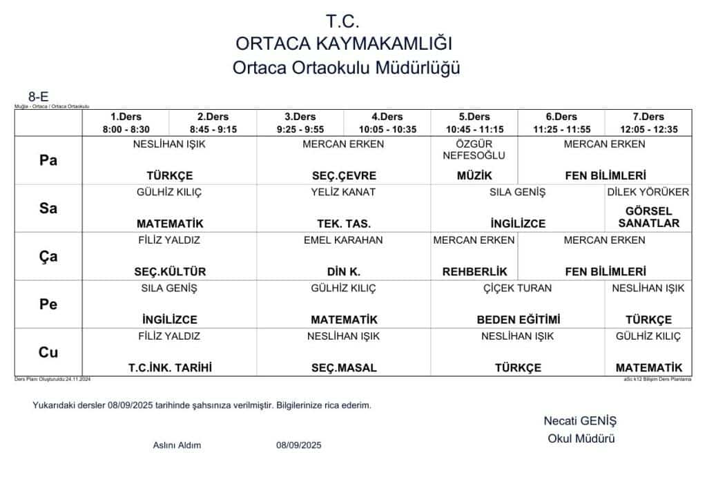 08/09/2025 TARİHİNDEN İTİBAREN GEÇERLİ DERS PROGRAMIMIZ