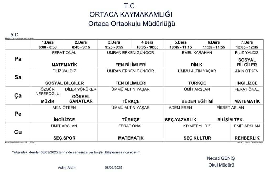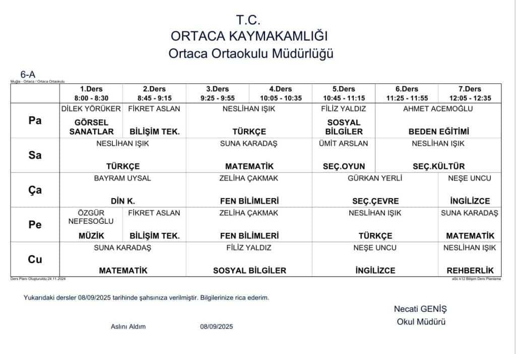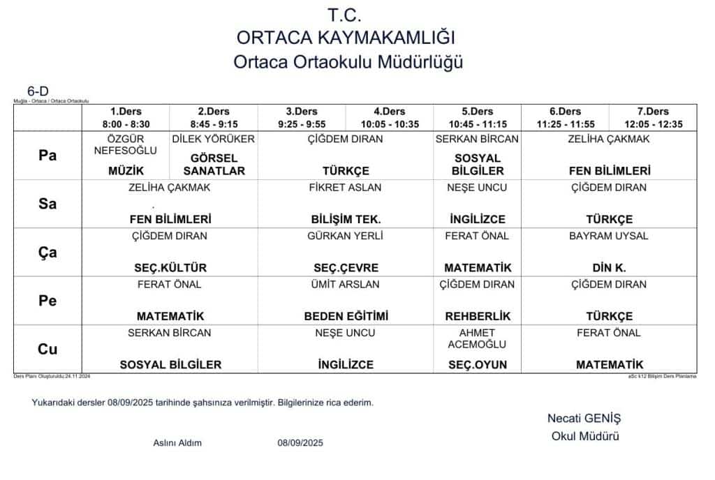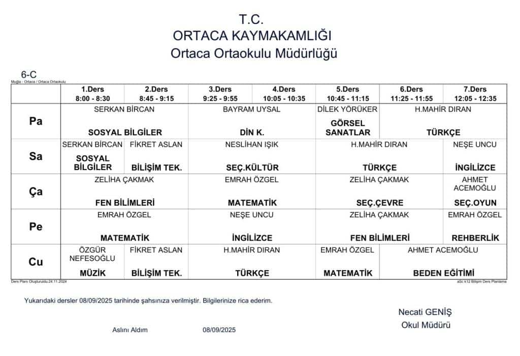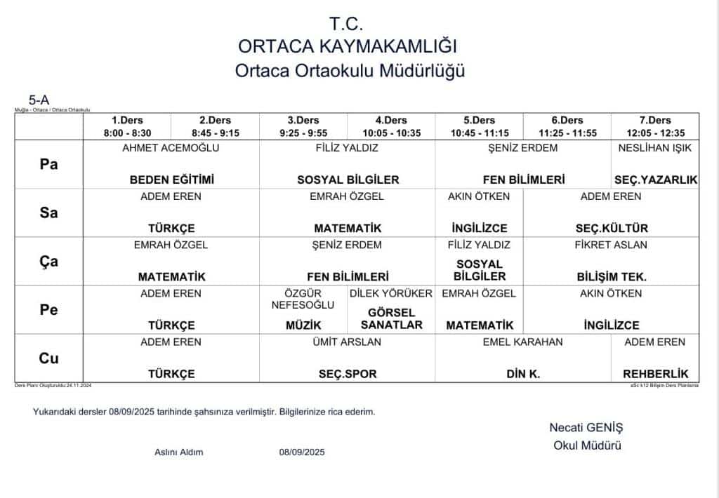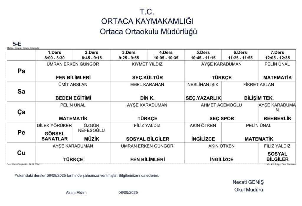 08/09/2025 TARİHİNDEN İTİBAREN GEÇERLİ DERS PROGRAMIMIZ